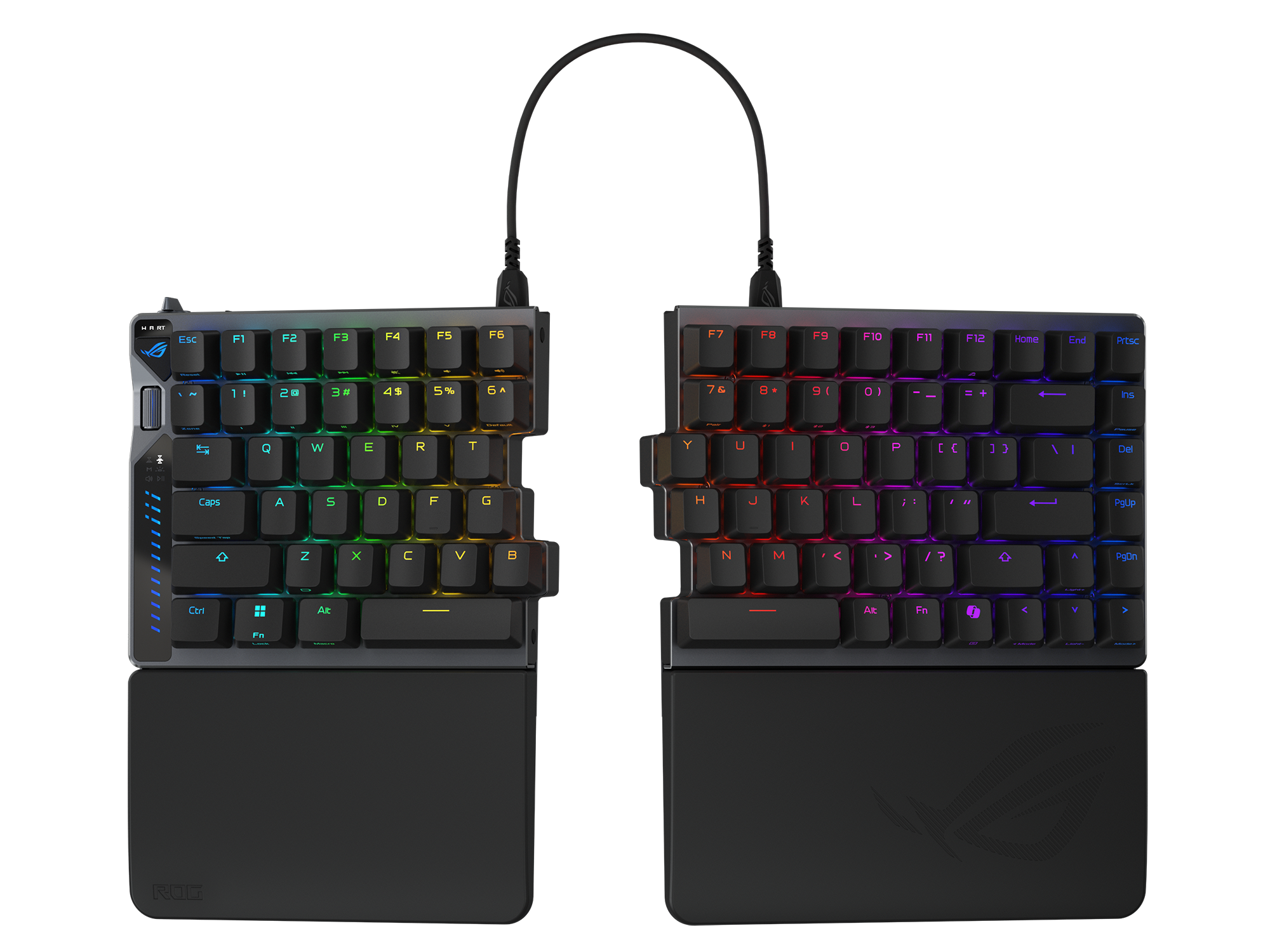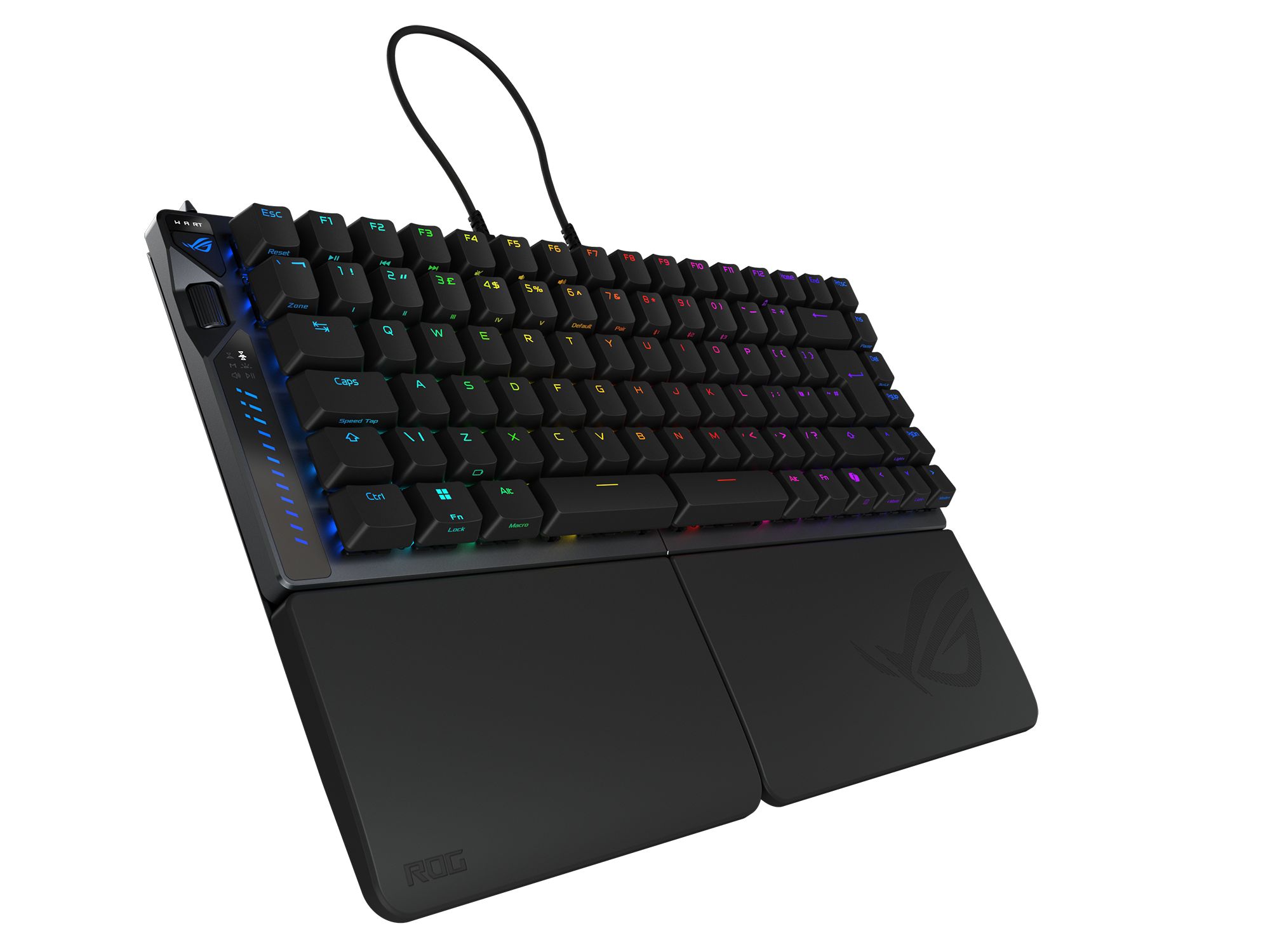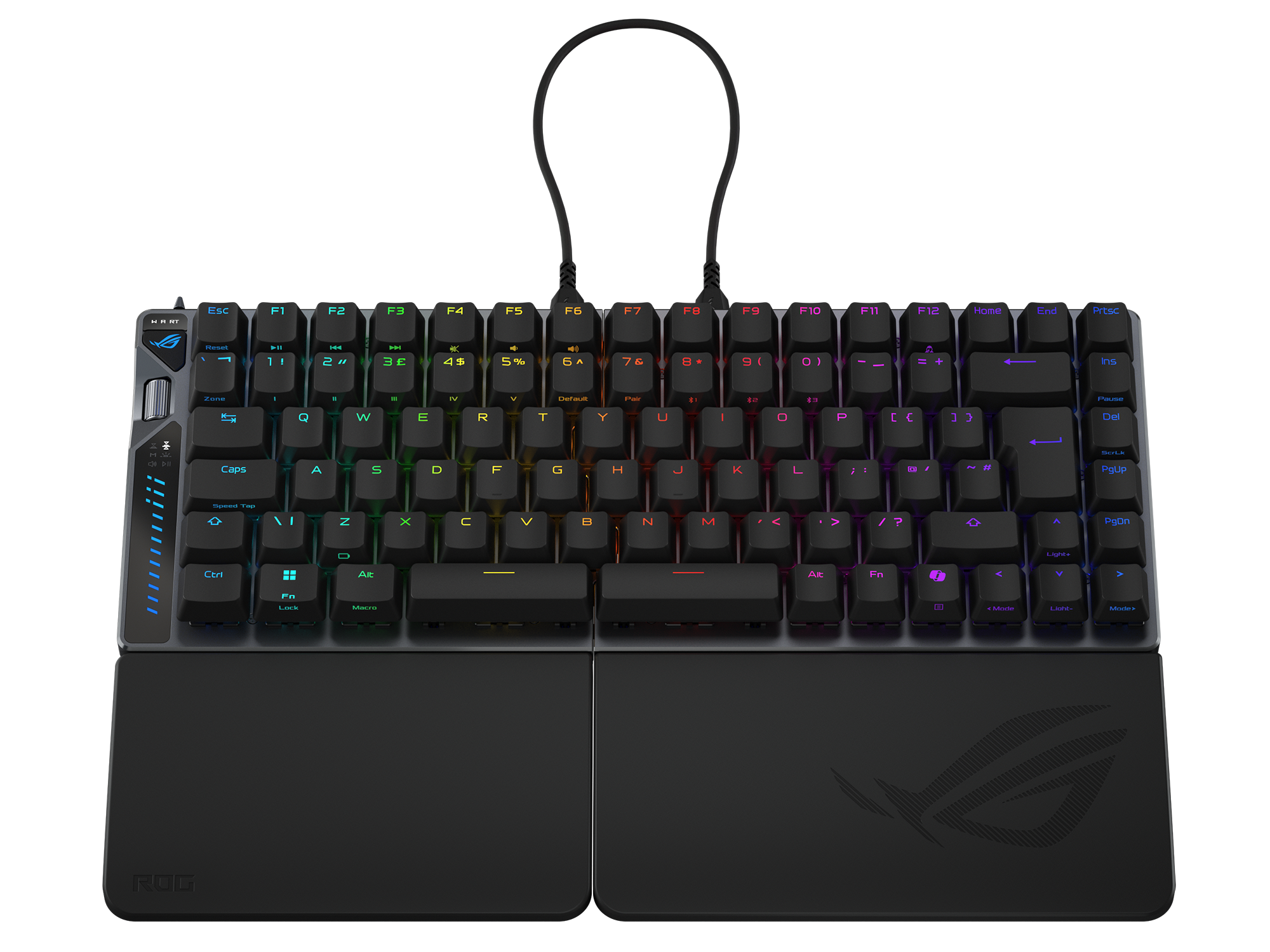 ROG Falcata is a 75% split gaming keyboard designed for precision and flexibility. It features the hot-swappable ROG HFX V2 Magnetic Switch and ROG Hall Sensor for ultra-responsive keystrokes. It includes a Rapid Trigger toggle, intuitive multi-function wheel and button, ROG SpeedNova 8K wireless technology, and tri-mode connectivity. A unique Zone Mode optimizes hardware settings and primes the Falcata for top-tier performance in an instant. For user comfort, the Falcata includes four-layer dampening and detachable silicone wrist rests.