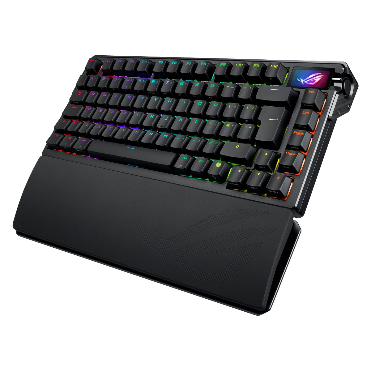 The ROG Azoth Extreme is a customizable 75% gaming keyboard with a premium aluminum-alloy chassis and metal frame. It features an 8000 Hz report rate with the ROG Polling Rate Booster and over 1600 hours of battery life in ROG SpeedNova 2.4 GHz wireless mode. The upgraded OLED touchscreen and three-way knob enable system monitoring and quick adjustments. The carbon-fiber positioning plate ensures a crisp typing sound, while three dampening layers absorb vibrations. An adjustable gasket mount with a paddle switch offers two typing preferences.