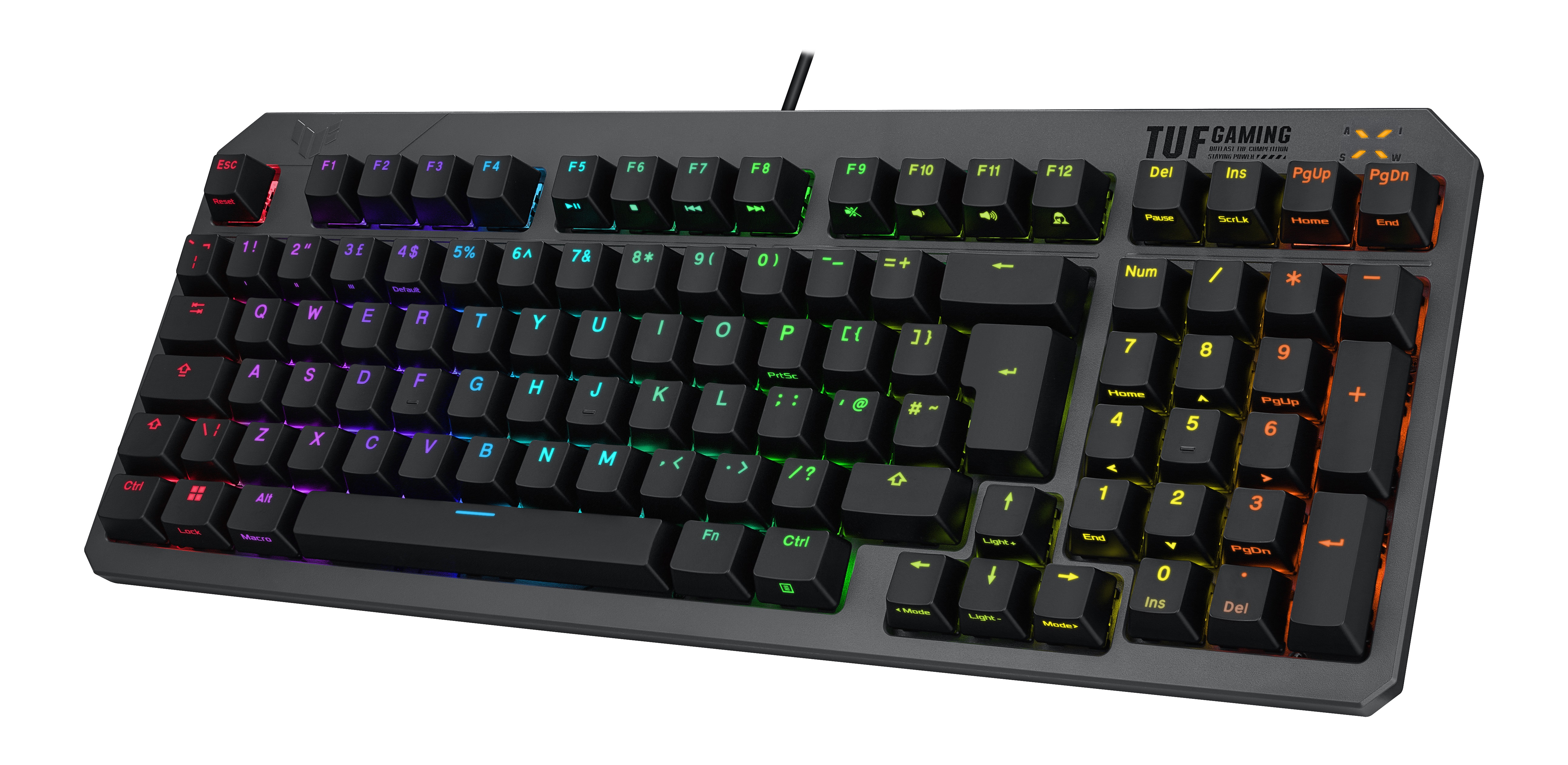 ASUS TUF Gaming K3 Gen II is a portable gaming keyboard that offers full functionality within a compact design. It has an IP57 waterproof and dust-resistance rating to ensure ample protection against desktop spills and dirt. TUF Gaming K3 Gen II boasts optical-mechanical RGB switches with a 100-million-keypress lifespan, plus an advanced gasket mount design and dampening foam for superior typing experiences. The detachable top cover allows for easy personalization and makes routine maintenance easy.