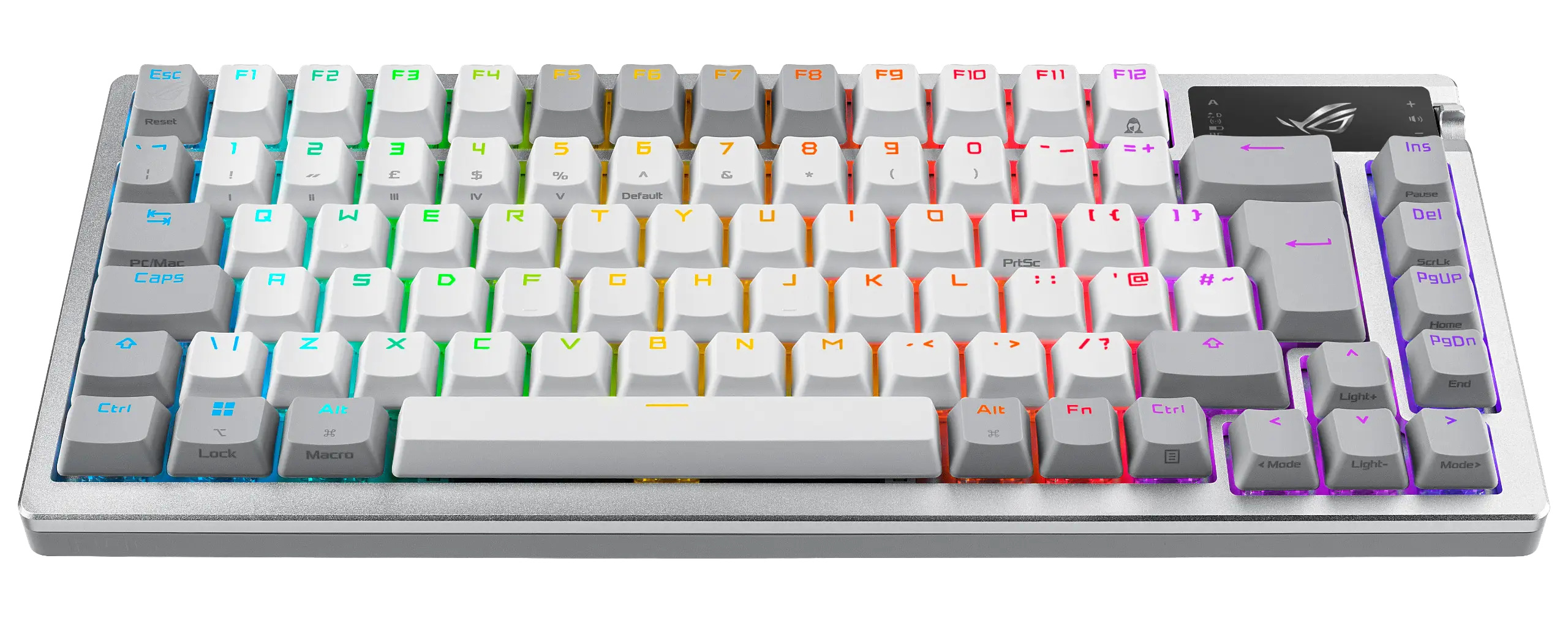 ROG Azoth is a 75% gaming keyboard bristling with DIY features traditionally found on premium custom keyboards. A metal top cover with silicone gasket mount and three-layer dampening, hot-swappable, pre-lubed ROG NX mechanical switches and keyboard stabilizer, ROG PBT doubleshot keycaps and bundled switch lube kit combine to create unprecedented typing experiences. ROG Azoth also has an OLED display with intuitive controls, versatile tri-mode connectivity with SpeedNova wireless technology in 2.4 GHz mode, three adjustable tilt positions, and MacOS support.