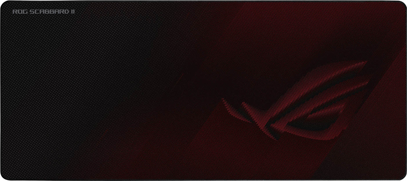 ROG Scabbard II extended gaming mouse pad with protective nano coating for a water-, oil-and dust-repellent surface, with anti-fray, flat-stitched edges and a non-slip rubber base.