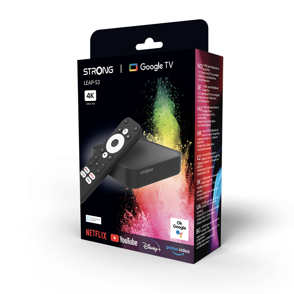 This small, compact smart Google TV box is the right choice for your TV. Connect the STRONG LEAP-S3UK to upgrade your TV to a Smart TV with direct access to the Google Play Store! This Google TV box is equipped with the latest version of Android 11 and offers you an excellent user experience. Further it is Google certified and gives access to numerous apps, streaming services and more. Enjoy your favourite movies directly from Netflix, YouTube, Prime Video or Disney+*. With an effective user interface, you can quickly find and enjoy the entertainment you want. LEAP-S3UK also comes with must-haves such as 4K UHD resolution, H.265 Decoding, Wi-Fi 5 Dual Band, Chromecast function and more. Dolby Vision-Atmos ensures the best picture and sound you ever seen before for your favourite film. With the fully-featured Google Assistant you can control playback, play or resume TV shows and movies with voice commands and get answers to trivia questions. USB port, Bluetooth 5.0, HDMI version 2.1 and Ethernet port make the package complete and offers you an unprecedented TV experience.