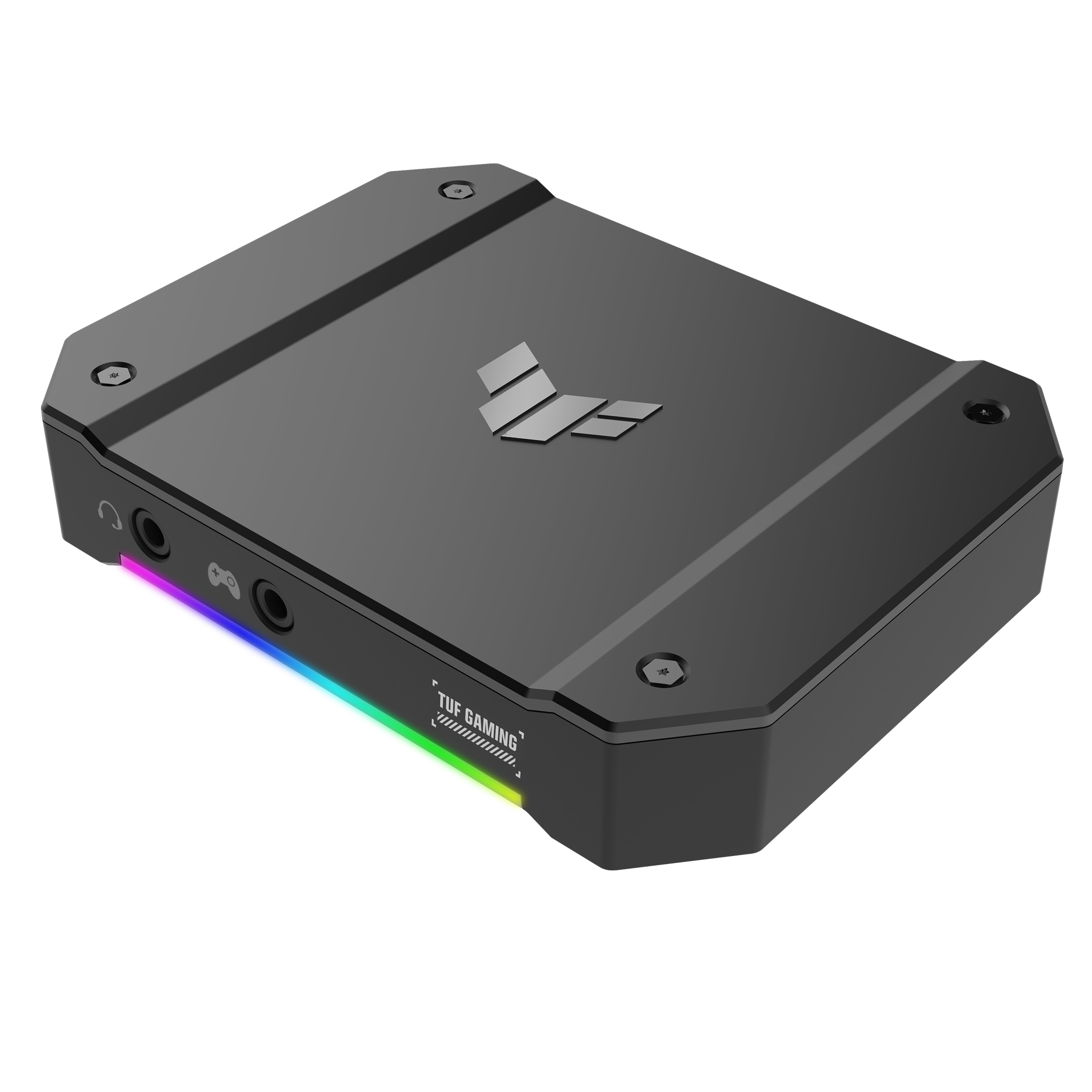 The front of ASUS TUF Gaming Capture Box is illuminated by an RGB lighting strip that conveniently indicates functional status.