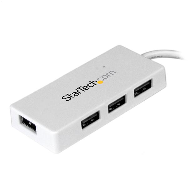 The ST4300MINU3W Portable 4 Port SuperSpeed Mini USB 3.0 Hub (White) lets you expand your USB connectivity by turning a single USB 3.0 port into four external USB 3.0 ports. The integrated cable design makes this mini USB hub the perfect accessory for your Mac / PC notebook or Ultrabook computer. The 4 Port USB 3.0 hub supports USB 3.0 data bandwidth (5 Gbps - up to 10x more than USB 2.0) and is backward compatible with USB 2.0 and 1.1 devices, ensuring flawless performance from all of your USB peripherals/devices, regardless of their age. Ideal for home and business users who require portability, the external USB 3.0 hub is USB-powered and features a rugged, compact design with a built-in cable so no additional cables are needed to connect the hub to your system. Backed by a StarTech.com 2-year warranty and free lifetime technical support.