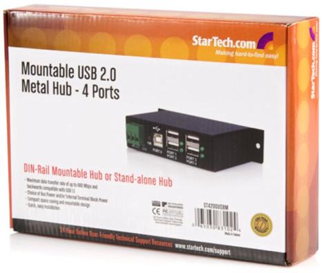 This sturdy, industrial grade USB hub can be wall mounted or installed onto a DIN rail for convenient access to its 4 female USB ports, providing a work area, server room, or industrial area with USB 2.0 connectivity.