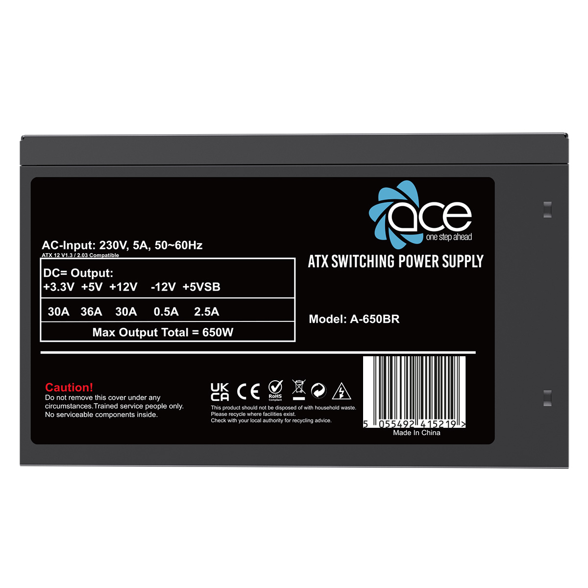 Ace PSUs are certified RoHS compliant and with power factor control-giving you a safe and stable foundation to build your system from. Ace PSUs come with a superb 12cm fan that offers a quiet operation but with excellent cooling meaning you are working in a more peaceful environment and the right cooling ensures maximum lifespan of your products. Supplied with all the appropriate cables Ace provides maximum compatibility with popular CPUs and mainboards.