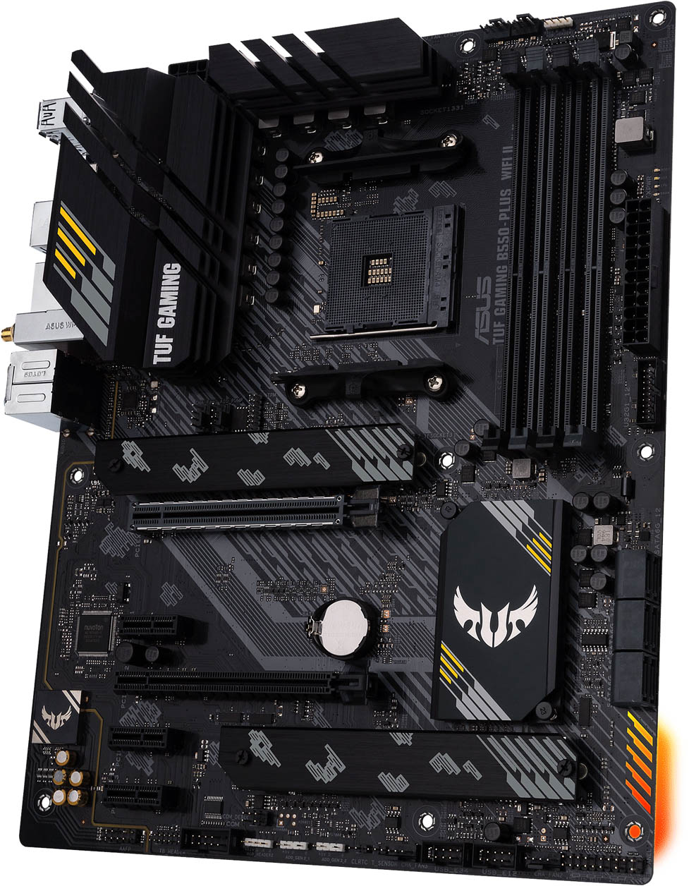 TUF GAMING B550-PLUS WIFI II provides a complete, high-performance gaming package with a long list of features to improve your experience, including ultrafast networking for smoother online gameplay, pristine audio with positional cues for FPS gaming, and onboard RGB lighting that syncs with attached accessories to help you create a personalized gaming atmosphere.