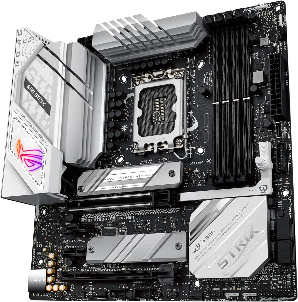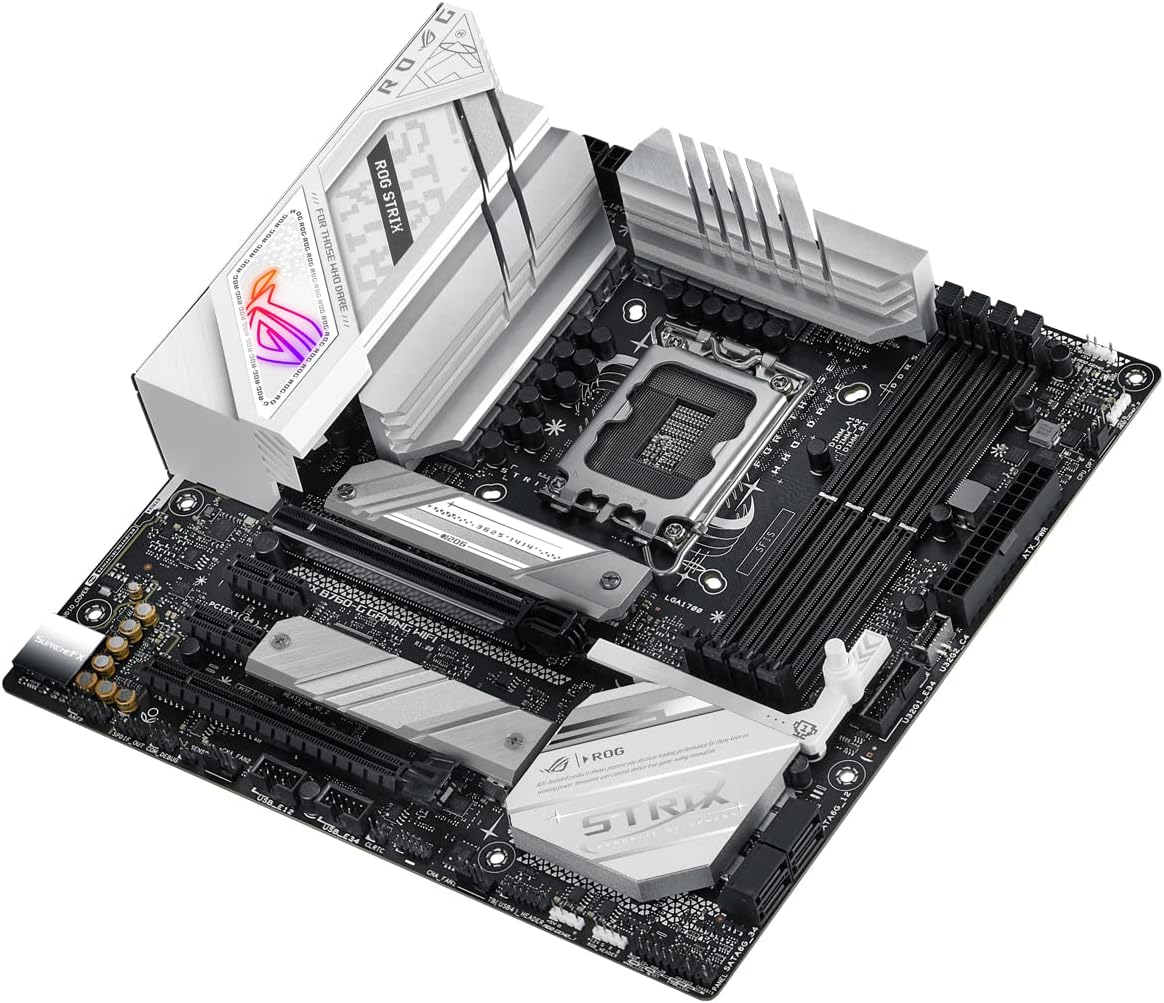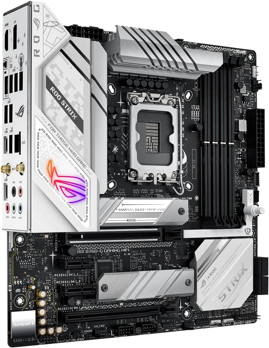 Midsize overperformer: the ROG Strix B760-G Gaming Wi-Fi is a monochrome powerhouse, ready to propel your next mATX rig. It bears the same high-bandwidth connectivity as its trusty counterpart, but diverges with lightning-fast DDR5 memory and buffed power stages to complement high-speed Intel 13th Gen processors. White and silver accents pair perfectly with the ASUS AP201, and retro insignias give it a dash of classic Strix style.