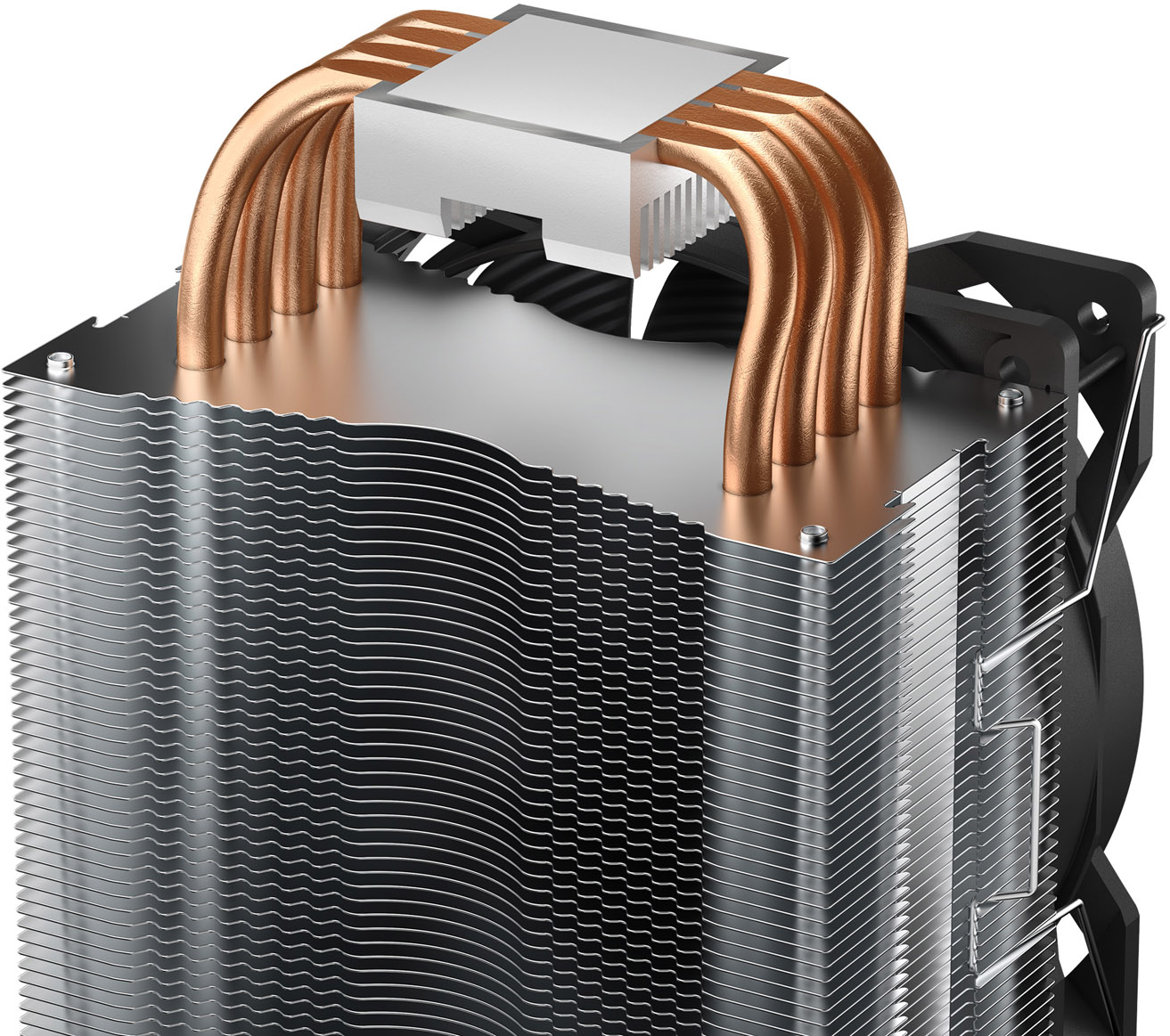 Pure Rock 2 is equipped with four 6mm heat pipes that have aluminum caps. This is key to its great cooling performance, because they transport the heat to optimum locations on the cooling fins.